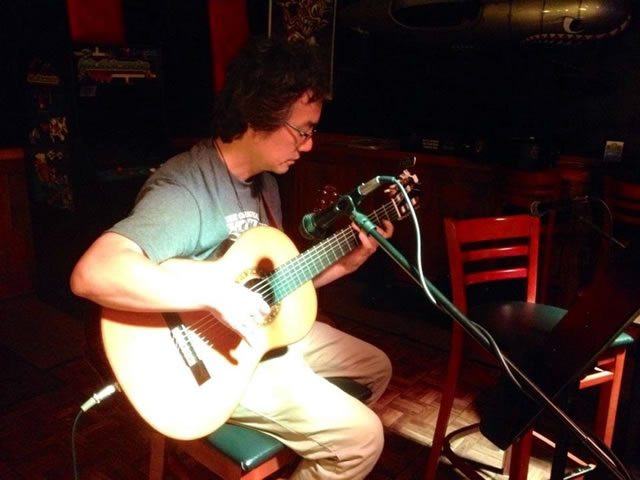 When we went inside, it was crowded with people, and I was a little scared to think that they all came in the cars and motorcycles we saw outside. We found a vacant table and Mr. R's fellow musicians joined us and we were eating hamburgers when a person with a microphone announced, "Let's start soon," but the inside of the restaurant was still as noisy as ever. After several groups performed, it was Mr. R's turn and he started playing that "A Whiter Shade of Pale." When I play this song in front of people, I leave out the organ part that includes the high notes in the interlude, but he played that part too. It was impressive. However, the inside of the restaurant was so noisy that his sound was drowned out by the cheers in the back. I was next, so I was tuning my guitar at the side of the stage, thinking, "This is tough," and was a little hesitant. I started with an up-tempo song (I forget what it was) to attack with a song with a little more momentum, but it was like fuel to the fire and I couldn't control myself at all. So, I started playing Billy Joel's "She's Always A Woman," and I heard some people in the front row say, "Isn't this Billy Joel?", and then I heard the first "shhh, shhhh" sound since Georgetown, Texas. Both Mr. R and I were surprised. After the performance, I was taking a break outside, and the old man in the sleeveless leather jacket and some bad-boy-looking people came up to me with big smiles and asked for a handshake. It was the same as the first day of the open mic in Orlando, Florida. All's well that ends well.