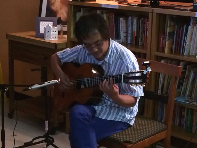 I saw a commercial that seemed to be produced by the Japanese government several times every time I turned on the TV at the motel, and I happened to have a video camera on hand, so I recorded it from the middle. At the end, Prime Minister Abe appeared and appealed for the message that the future is an era in which women will play an active role, but on the other hand, it could also be interpreted as a sign that women have not been allowed to play an active role up until now, so it was not a very pleasant thing to watch. The next morning, Bill Godwin, the owner of a general store/bookstore/cafe that I was playing at in Methuen, contacted me to say that his guitar friend D, who I was looking forward to seeing, had just had surgery and needed to rest, so he could not come. I didn't have any plans for the daytime, so I replied that I would come if Mr. D didn't mind, and he sent me his address. Actually, I hadn't driven since I moved east during my study abroad, so it was refreshing and fun to drive on winding roads that I didn't have in the west. Glenn Miller was always playing in my head. I had new recordings on my iPod touch, but something was different. What I was hearing was not clear sound, but old recordings (I ended up getting it in the west a few weeks later). Mr. D is a jazz finger stylist, and we had a great time together, holding guitars. Considering his physical condition, I left after about an hour, but he was so happy that I was there that I felt embarrassed. This kind of mobility is also unique to guitar players.